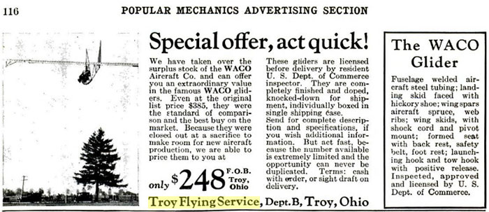 Addendum: The main Troy Flying Service was in Troy, OH. The August, 1931 issue of Popular Mechanics (PM) magazine posted an advertisement for the company, below. It appeared that Waco gliders were enduring a major price cut due, most likely, to the deepening of the Great Depression.