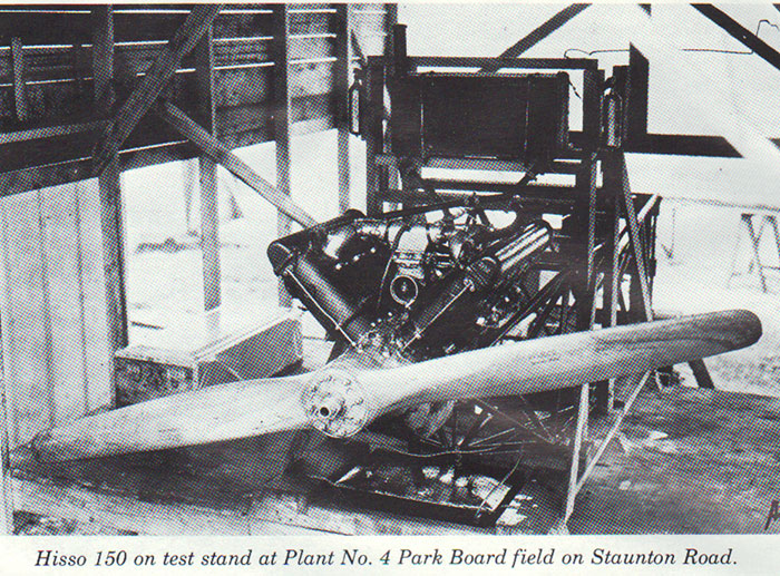 A factory new Hisso 150HP engine sits on a test stand at the Waco factory, below. Note the radiator suspended above the rear of the engine. The photograph is from this REFERENCE, page 52.
