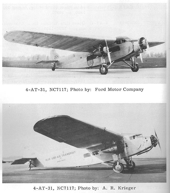 The top photograph, by the Ford Motor Company, is probably ca. 1928 when the airplane was brand new. The bottom photo, in Blue Bird Air Transport livery, is probably ca. 1933-1935.