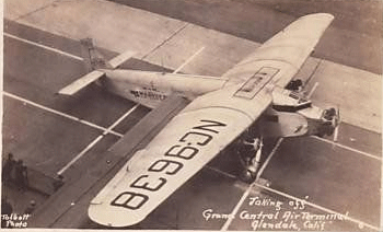 The photograph, left, is on a photo postcard mailed and postmarked August 22, 1932. Notice the covered canopy, just behind the starboard wing, leading across the ramp all the way to the airplane door. The message on the back of the card said, "Dear Dad, Just dropped down out of the clouds from airplane trip San Diego to L.A. Mother was the best sport possible. See you soon. Love Walter." It was addressed to Walter's father in West New Brighton, NY.